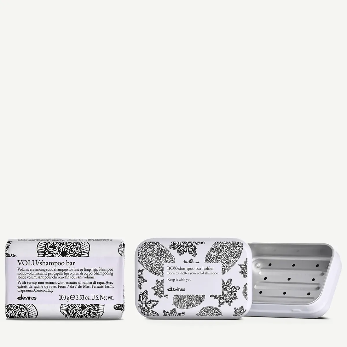 Volume Enhancing solid shampoo bar and caseLovely smoothing solid shampoo for coarse or frizzy hair. Get started with your Shampoo Bar by purchasing it alongside the aluminum container case. This shampoo bar case is the perfect pair with your shampoo bar as it is durable and made from resistant material. It is the idea